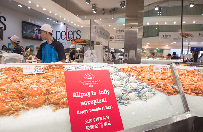 10月27日,悉尼海鮮市場,商家祝你天貓雙11快樂,并支持支付寶付款。