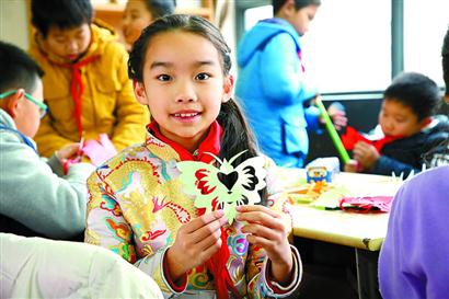 小學(xué)生展示自己剪好的“蝴蝶”作品。