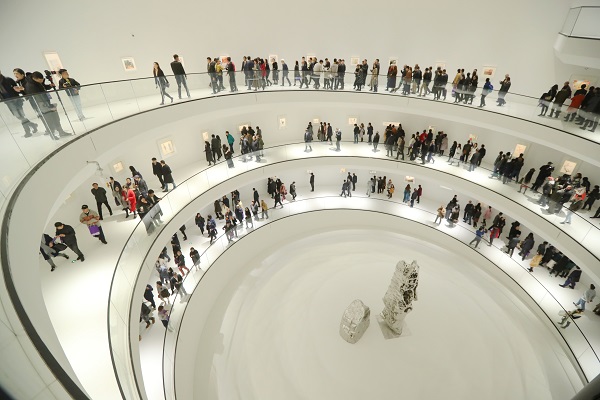 開館僅3個多月、位于閔行七寶的寶龍美術(shù)館有一個類似紐約古根海姆美術(shù)館的圓形展廳,春節(jié)入館人數(shù)創(chuàng)下新紀(jì)錄,單日入館人數(shù)近4000人,會員卡銷售1500余張,這在新晉民營美術(shù)館中算得上網(wǎng)紅級。