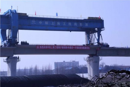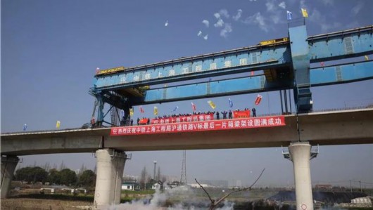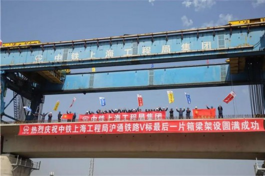 滬通鐵路一期,最后一片箱梁架設(shè)現(xiàn)場(chǎng)▼