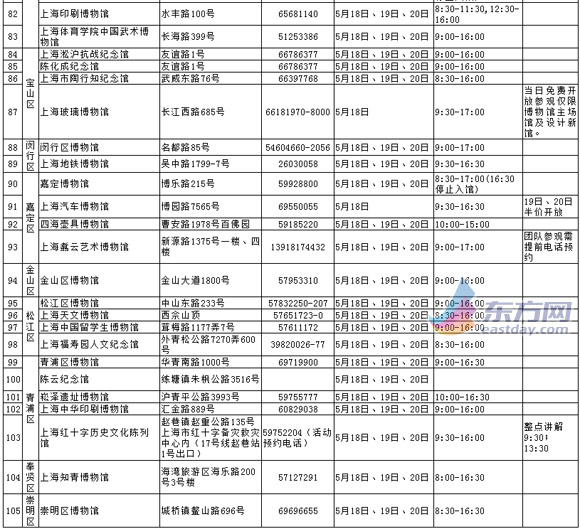 繼去年的104家之后,今年免費(fèi)開放的博物館數(shù)量與去年基本持平,105家博物館向公眾免費(fèi)開放。包括新增的上海市歷史博物館(上海革命歷史博物館)、國際乒聯(lián)博物館等。其中,80%的博物館連續(xù)三天免費(fèi)開放,從5月18日至5月20日,免費(fèi)時(shí)間延長至周末,市民可挑選合適的時(shí)間參觀。而上?萍拣^、上海觀復(fù)博物館、上海自然博物館和上海電影博物館5月18日當(dāng)天半價(jià)開放。