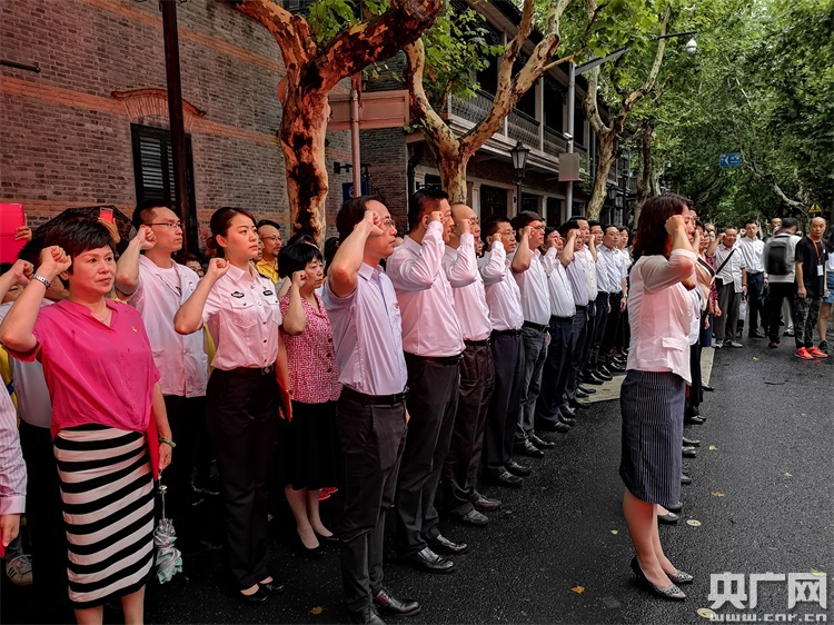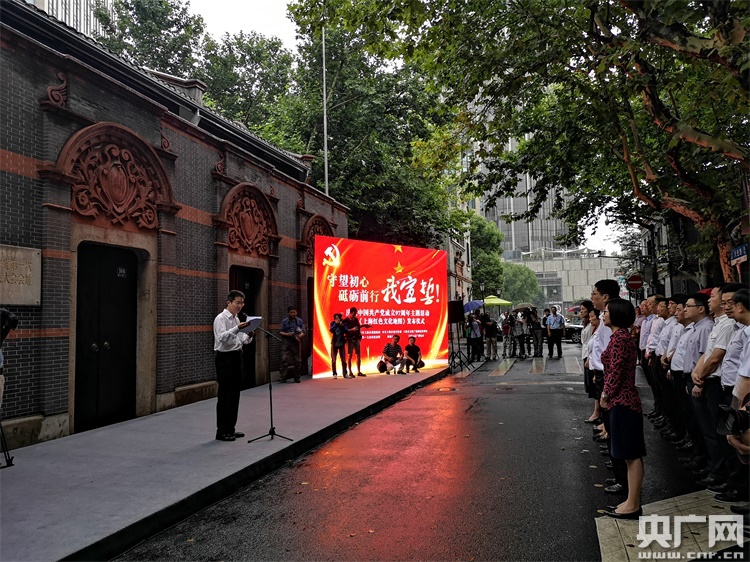 央廣網(wǎng)上海7月1日消息(記者傅聞捷)今天上午,為慶祝中國(guó)共產(chǎn)黨成立97周年,“守望初心,砥礪前行——我宣誓!”“七一”主題活動(dòng)在中共一大會(huì)址舉行。在剛剛接受聘書(shū)的中共一大會(huì)址紀(jì)念館首批領(lǐng)誓人的帶領(lǐng)下,數(shù)十名來(lái)自基層一線(xiàn)的黨員代表面對(duì)黨旗莊嚴(yán)宣誓,聆聽(tīng)“初心與使命”情景黨課并參觀陳列展。當(dāng)天,中共一大會(huì)址“全國(guó)重點(diǎn)文物保護(hù)單位”標(biāo)志牌揭牌,并向“黨的誕生地”黨員志愿服務(wù)隊(duì)授旗,《上海紅色文化地圖》也在活動(dòng)上首發(fā)。