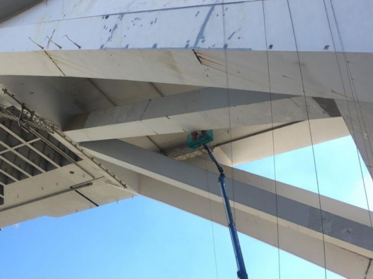 橋上,陽光把路面“炙烤”到60℃;橋下,三四個全副武裝的“蜘蛛俠”吹著浦江風,仔細打磨橋面原有涂裝。腳下的作業(yè)臺,由一根數(shù)十米長的機械手臂支撐,另一頭連接著一臺作業(yè)車,機械手臂正緩慢移動。
