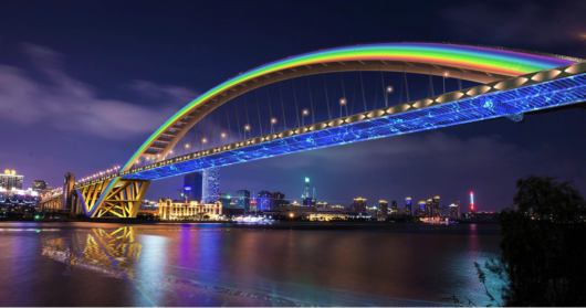 盧浦大橋的橋腹部也會被打亮,如果遇到重大節(jié)慶表演,橋腹可以進行動態(tài)投影。