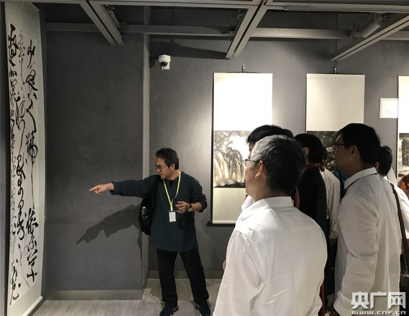 臺灣藝術(shù)家陳明德向觀眾介紹個人書法作品的創(chuàng)作過程(8月16日攝)。(央廣網(wǎng)記者 唐奇云 攝)