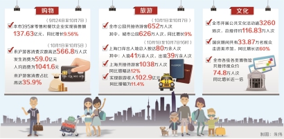 購物旅游方面,國慶假日上海旅游節(jié)和上海購物節(jié)雙節(jié)聯(lián)動,帶動消費(fèi)升級。據(jù)市商務(wù)委統(tǒng)計,9月24日至10月7日,本市395家零售和餐飲企業(yè)銷售額達(dá)到137.63億元,同比增長9.56%。其中佛羅倫薩小鎮(zhèn)、龍之夢、第一八佰伴等10家納入重點(diǎn)統(tǒng)計的零售商業(yè)企業(yè)共實(shí)現(xiàn)營業(yè)額9.99億元,同比增長10.1%。楊浦、長寧、徐匯、浦東、虹口、青浦和黃浦的樣本企業(yè)銷售額同比增長兩位數(shù)以上,其中楊浦和長寧同比增速高達(dá)32.8%和24.1%。據(jù)抽樣調(diào)查統(tǒng)計,國慶期間本市過夜游客的人均消費(fèi)為1091元/天,同比增長6.6%;旅游購物消費(fèi)的比重占總消費(fèi)34%,綜合拉動效益明顯。外省游客在滬旅游類消費(fèi)金額達(dá)到64.01億元,同比增長11.25%。