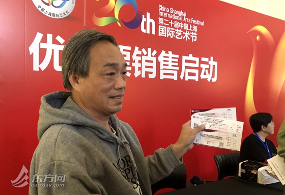 圖片說明:市民王福慶展示自己購入的中國上海國際藝術(shù)節(jié)優(yōu)惠票