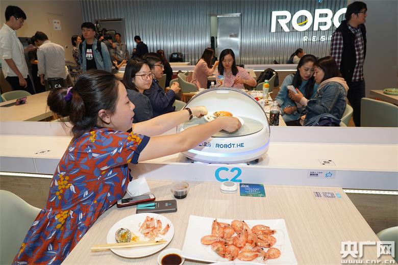 展會期間, 顧客可以在門店現(xiàn)場挑選海鮮,由餐廳幫忙加工成菜品,送到對應的桌前,還有收餐機器人收取餐盤。這款收餐機器人由阿里巴巴人工智能實驗室為盒馬量身打造,在展會開幕當天投入使用。
