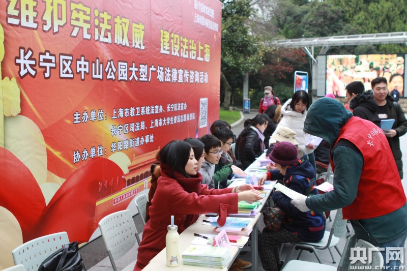 央廣網(wǎng)上海12月9日消息(記者吳善陽(yáng) 通訊員焦葦)上海市第三十屆“憲法宣傳周”持續(xù)到今天,上海市教衛(wèi)系統(tǒng)法宣辦聯(lián)合全市多所高校,舉辦以“維護(hù)憲法權(quán)威建設(shè)法治上!睘橹黝}的國(guó)家憲法日暨上海“憲法宣傳周”活動(dòng)。8日上午,在中山公園正門(mén)主會(huì)場(chǎng),會(huì)同長(zhǎng)寧區(qū)法宣辦等單位聯(lián)合開(kāi)展憲法宣傳、法律咨詢(xún)與援助等專(zhuān)題活動(dòng)。華東政法大學(xué)等高校的大學(xué)生普法志愿者、法學(xué)專(zhuān)家以及市教衛(wèi)系統(tǒng)法宣辦、長(zhǎng)寧區(qū)司法局的有關(guān)領(lǐng)導(dǎo)嘉賓參與了主會(huì)場(chǎng)活動(dòng)。據(jù)悉,今年的“憲法宣傳周”參加志愿活動(dòng)的師生達(dá)600多人次,咨詢(xún)服務(wù)對(duì)象超千人,宣傳輻射面過(guò)萬(wàn)人。