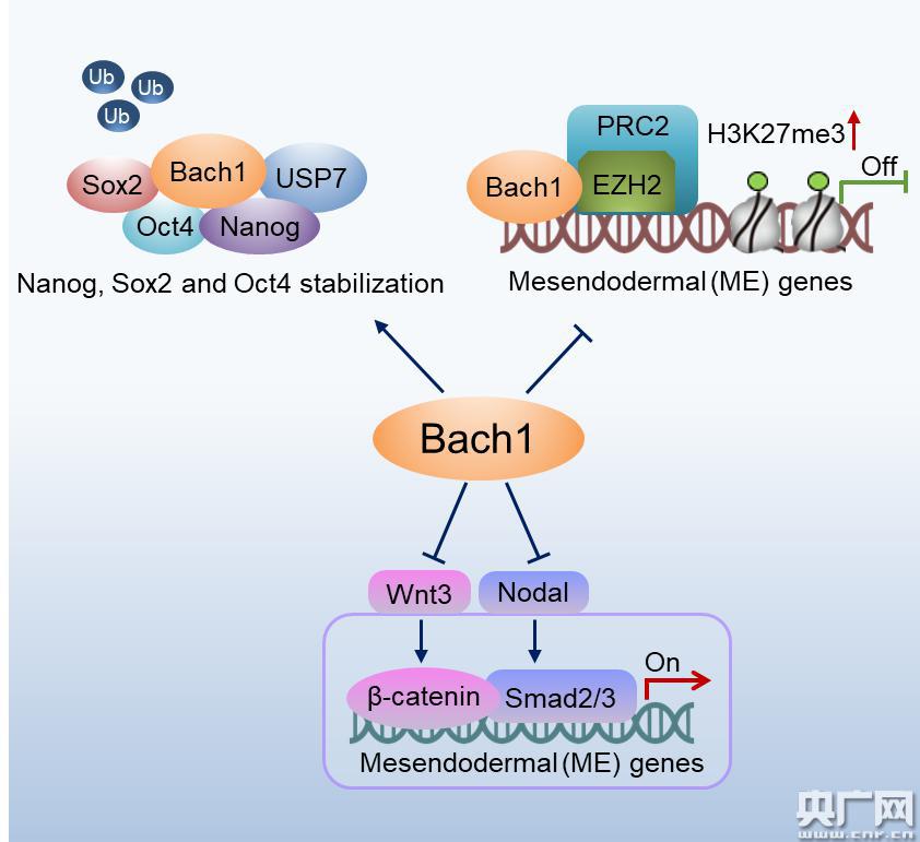 Bach1維持人胚胎干細(xì)胞自我更新并抑制干細(xì)胞向中胚層和內(nèi)胚層分化的機(jī)制圖(央廣網(wǎng)發(fā) 圖:尹逸柔)