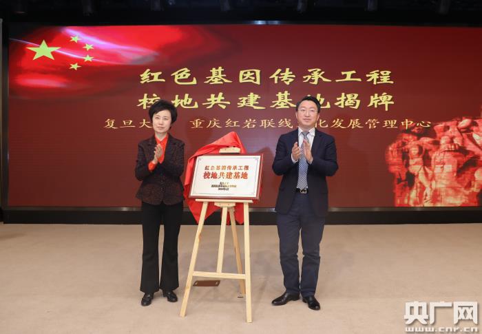 復(fù)旦大學(xué)黨委書記焦揚(yáng)和重慶紅巖聯(lián)線文化發(fā)展管理中心黨委書記朱軍為“紅色基因傳承工程”校地共建基地揭牌。(央廣網(wǎng)發(fā) 慕梁 攝)