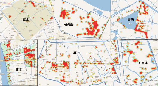 6座郊野公園的熱力圖,可以看到廊下郊野公園的客流比較分散,浦江、青西、長興島郊野公園的客流集中在某幾個區(qū)域