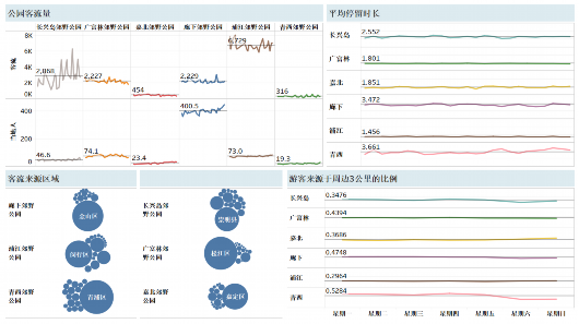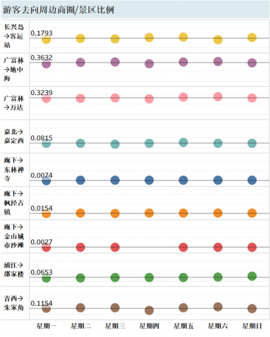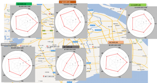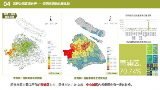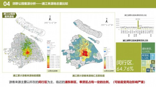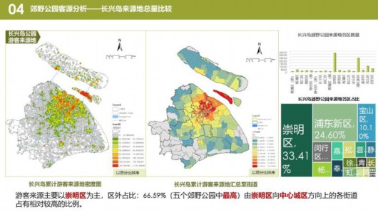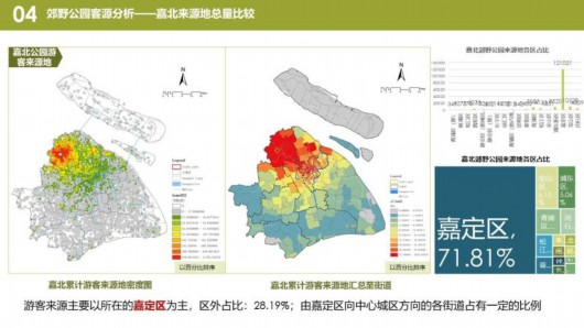 熱力圖顯示,在嘉北郊野公園,游客集中在1號門附近景區(qū),游覽與觀光車路線一致。長興島郊野公園,游客集中在靠近高速公路的燒烤區(qū)和環(huán)保博物館。青西郊野公園,游客大多沿著湖泊觀光。浦江郊野公園,“活力森林區(qū)”“奇跡花園區(qū)”是熱門景點。廣富林郊野公園,“房車營地”“敞篷營地”“馬術(shù)俱樂部”是游客聚集地。