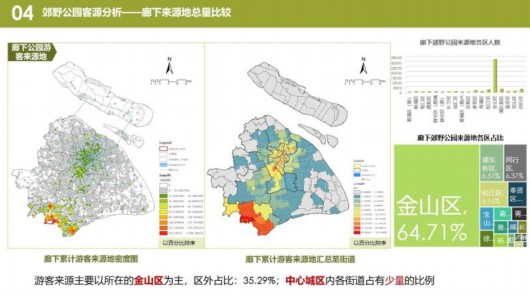 有趣的是,研究者發(fā)現(xiàn),逛過廣富林郊野公園的游客,通常會到周邊逛一逛。約有30%的游客,游玩廣富林郊野公園后,會前往周邊的兩個商業(yè)中心——開元地中海和松江萬達。青西、嘉北、浦江、長興島郊野公園中,均有6%至18%的客流,會到周邊商圈或景區(qū)逛一逛。不過,在廊下郊野公園,只有1%的游客會去周邊游玩。
