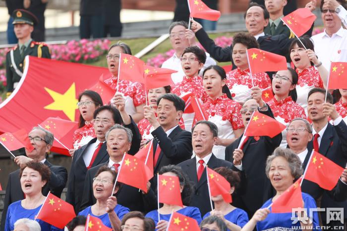 在華東師范大學閔行校區(qū)圖書館前,當《我和我的祖國》唱至高潮,現(xiàn)場沸騰了。這富有感染力的歌聲里流淌著砥礪報國的紅色血液,師生同唱一首歌,銘記崢嶸歷史,共同感受蓬勃涌動的愛國熱情。