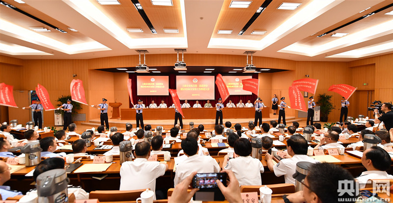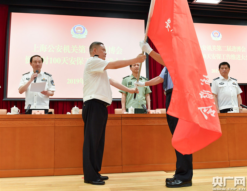 央廣網(wǎng)上海7月27日消息(記者周洪)“沖刺百天,決勝進博!”誓言錚錚回響,戰(zhàn)旗獵獵揮舞。第二屆中國國際進口博覽會倒計時第100天(7月27日)之際,上海市公安局舉行安全保衛(wèi)工作推進大會。副市長、市公安局局長龔道安向14個工作組代表授“中國國際進口博覽會安保突擊隊”戰(zhàn)旗并講話。