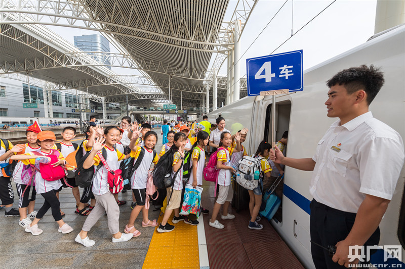 一群小朋友旅客在常州站客運人員引導(dǎo)下有序上車。 (央廣網(wǎng)發(fā) 李忱 攝)