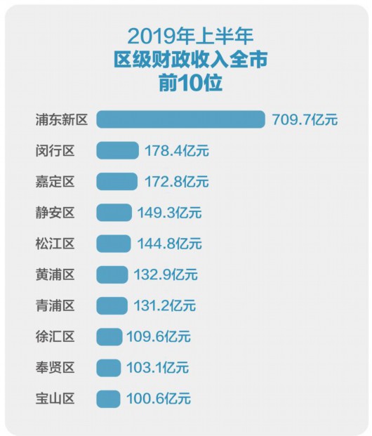 2019年上半年,區(qū)級(jí)財(cái)政收入排在全市前10位的是:浦東新區(qū),709.7億元;閔行區(qū),178.4億元;嘉定區(qū),172.8億元;靜安區(qū),149.3億元;松江區(qū),144.8億元;黃浦區(qū),132.9億元;青浦區(qū),131.2億元;徐匯區(qū),109.6億元;奉賢區(qū),103.1億元;寶山區(qū),100.6億元。