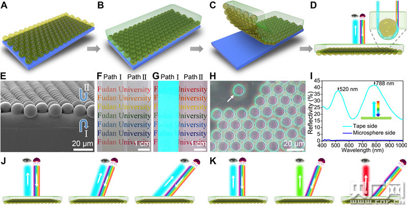 圖1. 逆反射結(jié)構(gòu)色薄膜的(A-D)制備步驟, (E-I)結(jié)構(gòu)和光學(xué)特性,以及(J)照明/觀察同軸時(shí)隨角不變色和(K)照明/觀察不同軸時(shí)隨角變色的示意圖。