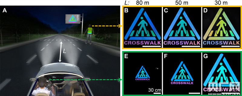 圖2.(A)逆反射結(jié)構(gòu)色薄膜制備的交通反光標(biāo)牌在夜間道路上應(yīng)用的示意圖,以及車輛距離標(biāo)牌不同距離L時(shí)(80米、50米、30米)(B-D)行人視角和(E-G)司機(jī)視角的照片。