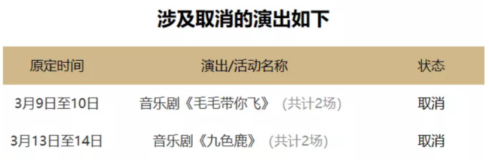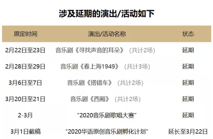 央廣網(wǎng)上海2月3日消息(記者林馥榆)新型冠狀病毒感染的肺炎疫情牽動(dòng)著所有人的心。為避免疫情擴(kuò)散,減少人員交叉感染,原定“2020原創(chuàng)華語(yǔ)音樂(lè)劇展演季”的演出將延期或取消,原定2-3月舉行的“2020音樂(lè)劇歌唱大賽”系列活動(dòng)與“2020華語(yǔ)原創(chuàng)音樂(lè)劇孵化計(jì)劃”將延期,新的演出/活動(dòng)時(shí)間將另行通知。