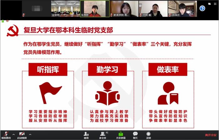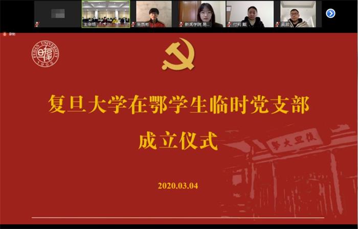 3月4日下午,一場跨越滬鄂兩地、意義不同尋常的網(wǎng)絡視頻會議舉行。復旦大學7個在鄂學生臨時黨支部在抗疫最前線成立。