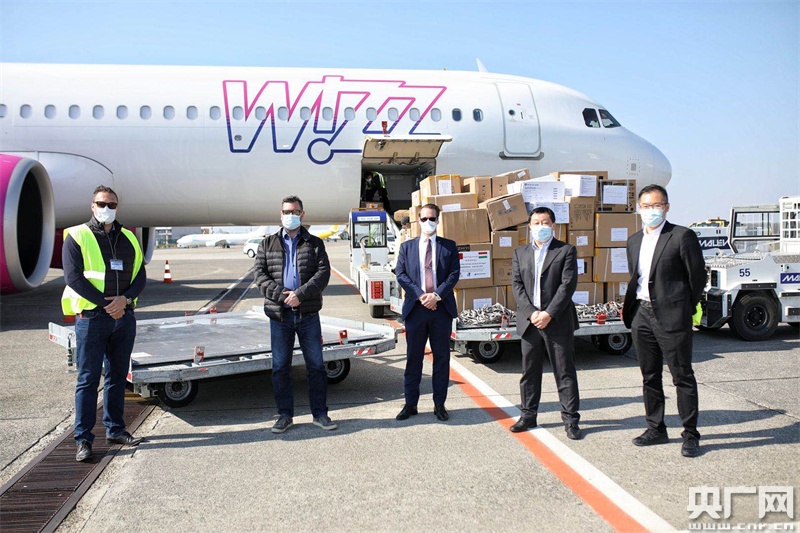 匈牙利創(chuàng)新技術(shù)部部長(zhǎng)顧問(wèn)伊凡·科瓦斯奇,匈牙利中央銀行行長(zhǎng)顧問(wèn)、復(fù)旦大學(xué)校友樂(lè)文特及中國(guó)銀行當(dāng)?shù)刎?fù)責(zé)人一同在機(jī)場(chǎng)接收物資