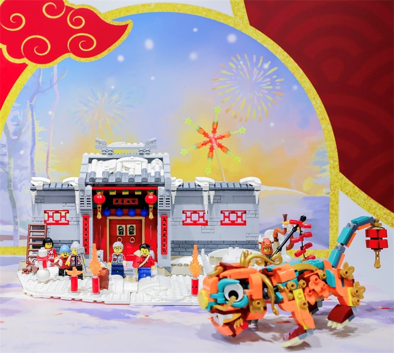 年味濃厚的樂高年的故事套裝以樂高積木顆粒的方式重現(xiàn)“年”的故事,同時歡慶農(nóng)歷新年。這款套裝以一座白雪襯托下的、帶有各種傳統(tǒng)裝飾的中式民居為主體。借助一只可擺出各種姿勢的年獸、雪人玩偶和六個樂高小人仔(其中包括爺爺,奶奶,三個孩子和一個假扮成牛的裝扮者),這款套裝非常適合展示和角色扮演,共同慶祝2021年中國農(nóng)歷牛年的到來。