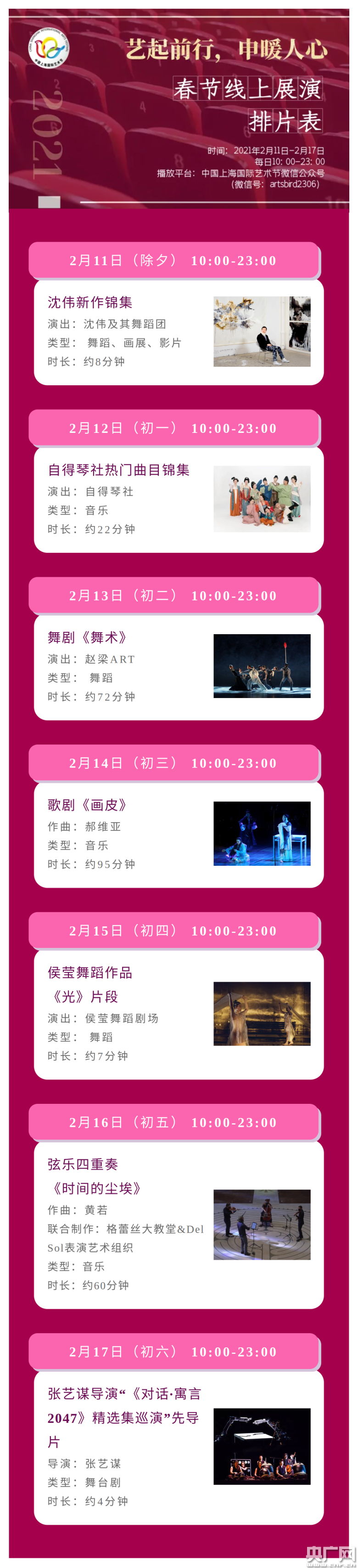 央廣網(wǎng)上海2月9日消息(記者林馥榆)這個春節(jié)準(zhǔn)備好被新春藝術(shù)大餐承包了嗎?春節(jié)期間,中國上海國際藝術(shù)節(jié)中心為大家精心挑選了七部精彩的藝術(shù)作品,從大年三十到正月初六(2月11日—2月17日),每天10:00—23:00,通過“中國上海國際藝術(shù)節(jié)”官方微信號限時播放,涵蓋音樂、舞蹈、舞臺劇等多種藝術(shù)形式,讓藝術(shù)的力量在新的一年與大家繼續(xù)“藝起前行”。