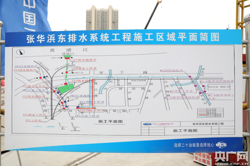 由中國二十冶建設(shè)的張華浜東排水系統(tǒng)工程項目施工區(qū)域平面圖(央廣網(wǎng)記者 韓曉余 攝)