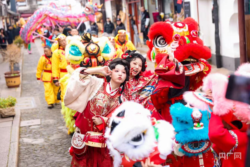 一支由舞龍舞獅、腰鼓蓮湘、漢服志愿者組成的國潮巡游隊(duì)伍在青浦區(qū)朱家角穿街而過。金紅相間的長龍隨鼓點(diǎn)翻騰,獅頭不時(shí)探向路邊店鋪,店主笑著往外遞糖。漢服方陣走過時(shí),一個(gè)舉著棉花糖的小姑娘愣住了。領(lǐng)頭的志愿者俯身遞給她一張“!弊,她接過來,半天沒說話,眼睛一直盯著人家衣服上的刺繡。