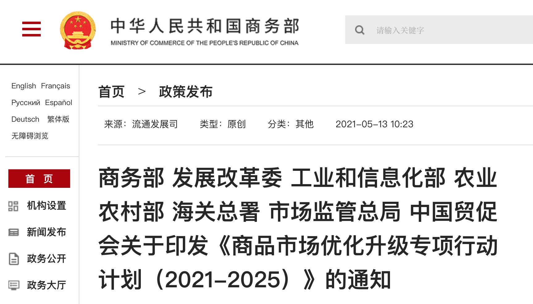 據商務部網站5月13日消息,為深入貫徹落實《中共中央國務院關于新時代加快完善社會主義市場經濟體制的意見》《中共中央辦公廳國務院辦公廳關于印發(fā)<建設高標準市場體系行動方案>的通知》等文件精神,推進商品市場創(chuàng)新發(fā)展,暢通國內大循環(huán),促進國內國際雙循環(huán),商務部、發(fā)展改革委、工業(yè)和信息化部、農業(yè)農村部、海關總署、市場監(jiān)管總局、中國貿促會聯合制定了《商品市場優(yōu)化升級專項行動計劃(2021-2025)》(下稱“《行動計劃》”)!