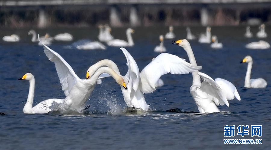 11月2日,幾只大天鵝在山西平陸黃河濕地水面上嬉戲。 近日,千余只大天鵝陸續(xù)飛抵山西省平陸縣黃河濕地,準(zhǔn)備在這里棲息越冬,黃河濕地變成了美麗的“天鵝湖”。 近年來(lái),山西平陸黃河濕地生態(tài)環(huán)境不斷改善,每年到此越冬的大天鵝數(shù)量在1萬(wàn)只左右。新華社發(fā)(薛俊 攝) -