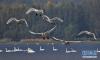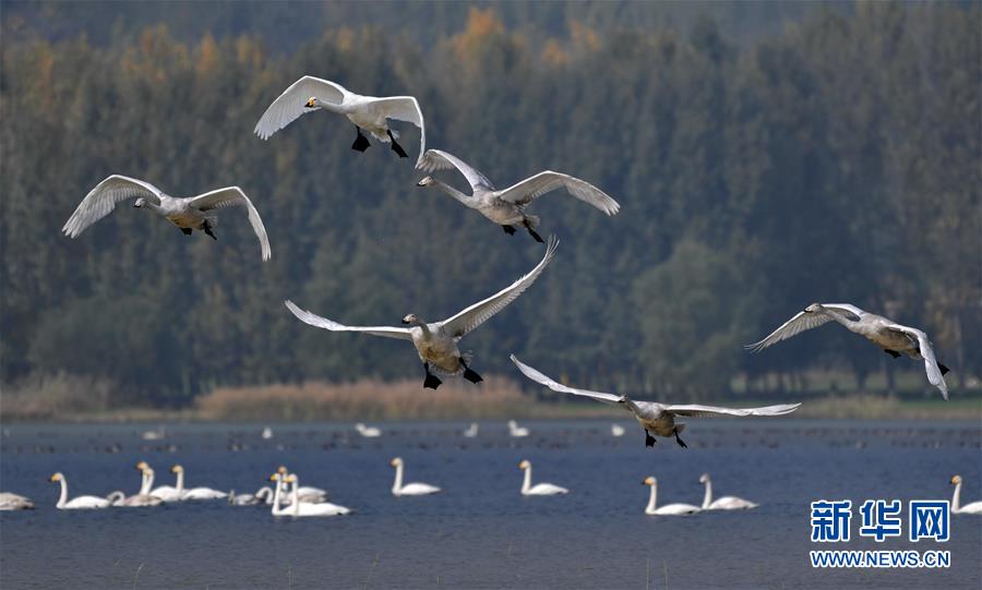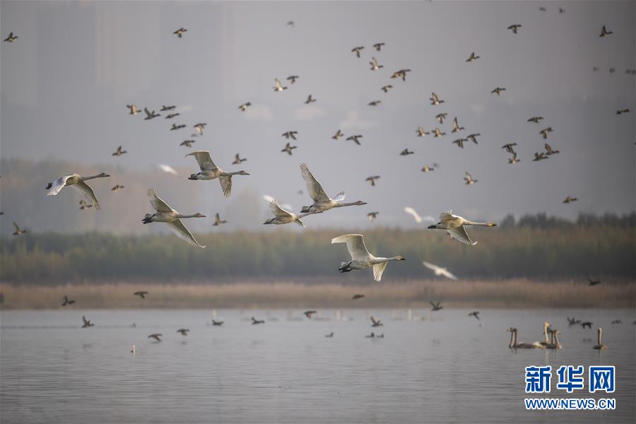 11月2日,大天鵝在山西平陸黃河濕地上空飛翔。 近日,千余只大天鵝陸續(xù)飛抵山西省平陸縣黃河濕地,準(zhǔn)備在這里棲息越冬,黃河濕地變成了美麗的“天鵝湖”。 近年來(lái),山西平陸黃河濕地生態(tài)環(huán)境不斷改善,每年到此越冬的大天鵝數(shù)量在1萬(wàn)只左右。新華社發(fā)(薛俊 攝) -