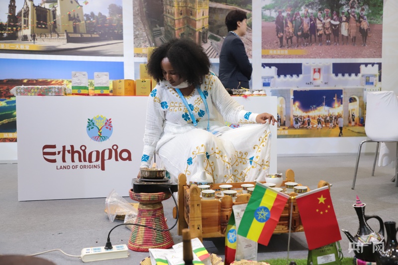 在埃塞俄比亞展區(qū),工作人員正在烹飪本國(guó)的特色咖啡(央廣網(wǎng)記者 侯凱奇 攝)