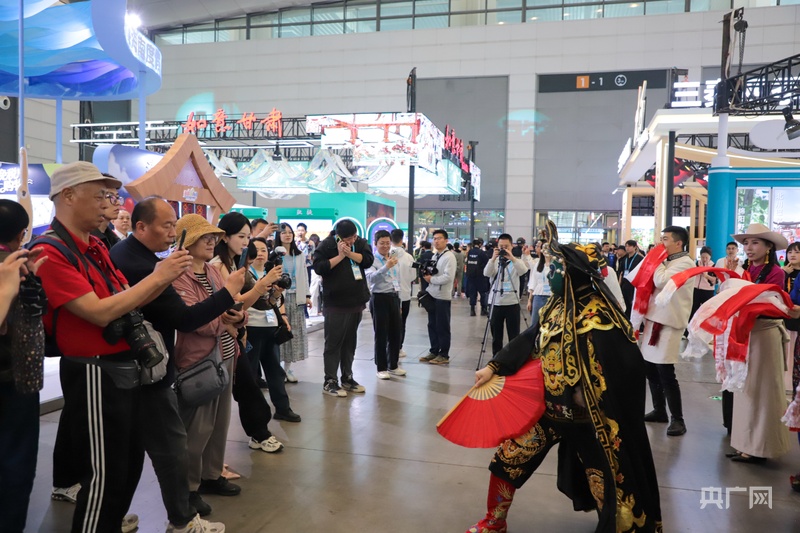 在四川展位前,游客正在欣賞川劇變臉表演(央廣網(wǎng)記者 侯凱奇 攝)