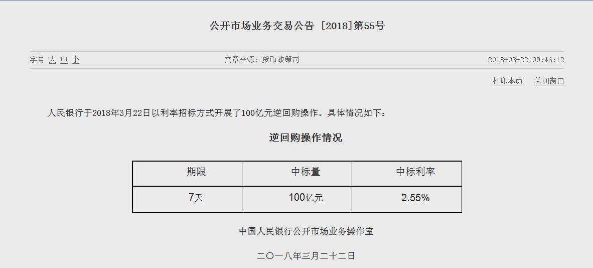 中新網(wǎng)3月22日電 據(jù)央行網(wǎng)站消息,2018年3月22日人民銀行開展的逆回購中標(biāo)利率小幅上行5個基點,對此,人民銀行公開市場業(yè)務(wù)操作室負(fù)責(zé)人表示,此次公開市場操作利率小幅上行符合市場預(yù)期,也是市場對美聯(lián)儲剛剛加息的正常反應(yīng)。