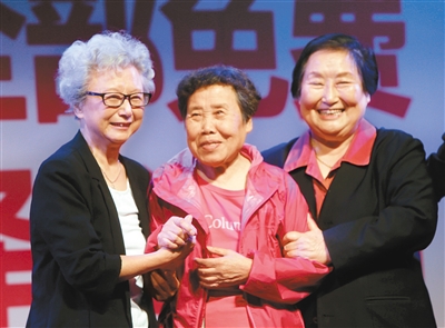 老藝術(shù)家全巧民(左)、李夕嵐和李愛琴(右)亮相招生啟動(dòng)儀式現(xiàn)場(chǎng) 記者 尚洪濤 攝