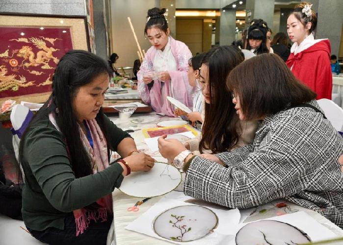 “媽媽,這潮繡真美!我想學。”11歲的賈一萌饒有興致地在潮繡展位前坐下,靜靜聆聽非遺傳承人李淑英老人講解潮繡的文化內(nèi)涵,并在老人的指導下體驗潮繡制作!俺崩C始于唐代,屬廣東刺繡,色彩濃艷美麗,在國內(nèi)外都享有盛譽! 李淑英老人告訴記者,她已經(jīng)是第三次來西安了,西安人民對潮繡很感興趣,她也非常樂于將祖國的優(yōu)秀文化遺產(chǎn)帶給西安人民,特別是西安的孩子們。