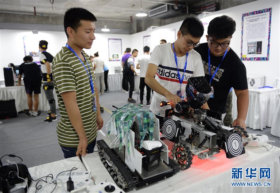 6月9日,來(lái)自西安文理學(xué)院的學(xué)生在展會(huì)上調(diào)試機(jī)器人。當(dāng)日,西安·雁塔大學(xué)生青春設(shè)計(jì)博覽會(huì)暨硬科技創(chuàng)新展在陜西西安大都薈開(kāi)幕,來(lái)自西安市雁塔區(qū)13所大專院校的學(xué)生攜平面設(shè)計(jì)、工藝美術(shù)、影視制作等七大門類1000余件優(yōu)秀設(shè)計(jì)作品及近70件“硬科技”作品參加展示。新華社記者 劉瀟 攝 -