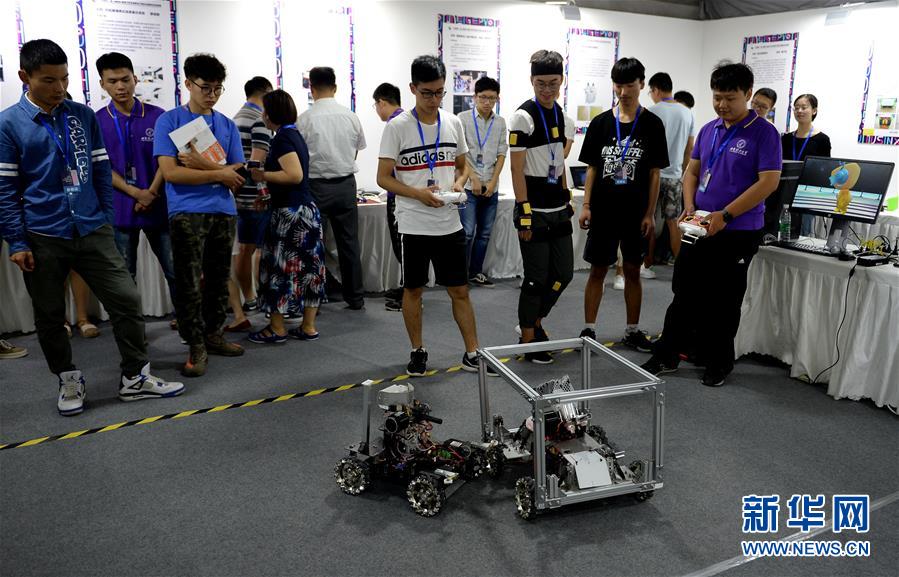 6月9日,參展學(xué)生在展會(huì)上進(jìn)行機(jī)器人對(duì)抗演示。當(dāng)日,西安·雁塔大學(xué)生青春設(shè)計(jì)博覽會(huì)暨硬科技創(chuàng)新展在陜西西安大都薈開(kāi)幕,來(lái)自西安市雁塔區(qū)13所大專院校的學(xué)生攜平面設(shè)計(jì)、工藝美術(shù)、影視制作等七大門類1000余件優(yōu)秀設(shè)計(jì)作品及近70件“硬科技”作品參加展示。新華社記者 劉瀟 攝