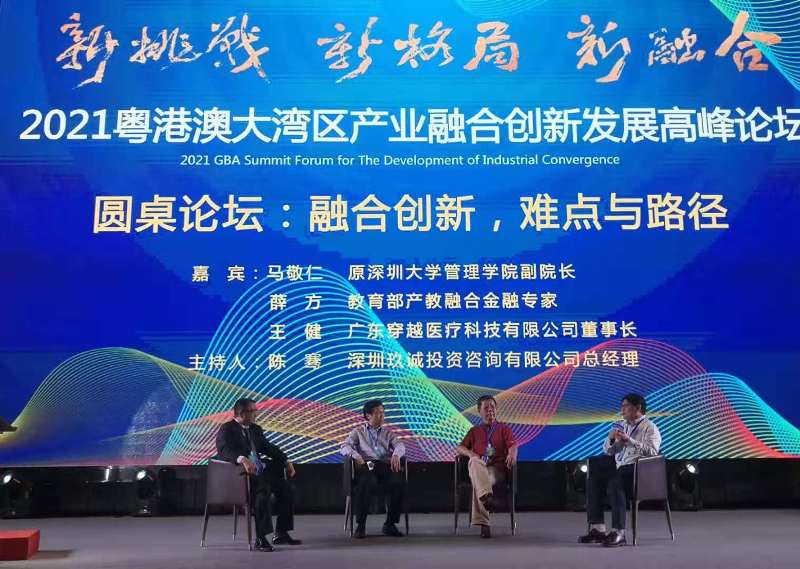 論壇上還開展了以“融合創(chuàng)新,難點(diǎn)與路徑”為主題的圓桌論壇,原深圳大學(xué)管理學(xué)院副院長馬敬仁、教育部產(chǎn)教融合金融專家薛方、廣東穿越醫(yī)療科技有限公司董事長王健、深圳玖誠投資咨詢有限公司總經(jīng)理陳騫等專家就此主題展開深度探討交流,碰撞出了不少精彩觀點(diǎn)。