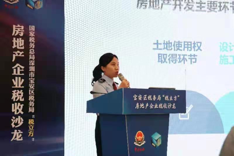 宣講會上,寶安區(qū)稅務局從土地使用權取得、設計建設施工、銷售、租賃使用四個環(huán)節(jié)展開稅收政策解讀,通過“政策+案例”的形式,全面介紹房地產(chǎn)業(yè)所涉及的稅收政策、容易出現(xiàn)的涉稅風險,以及為企業(yè)提供稅務內(nèi)控管理的若干建議。