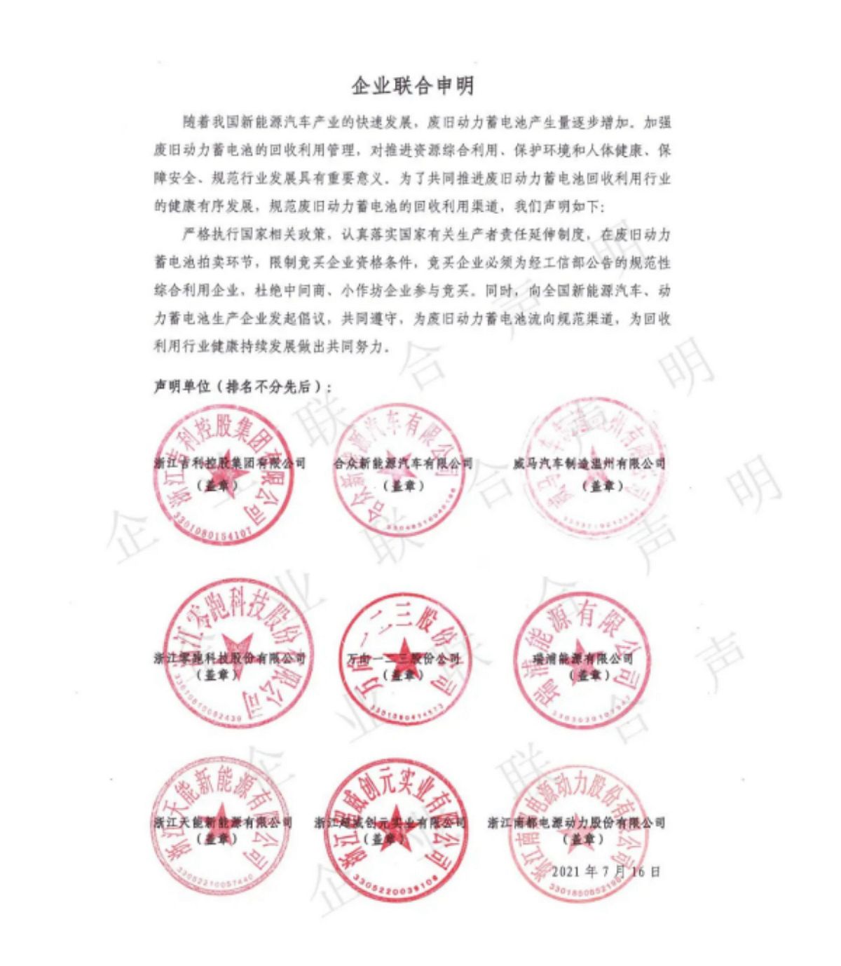 央廣網(wǎng)北京8月12日消息(記者 黃昂瑾)據(jù)杭州儲能行業(yè)協(xié)會微信公眾號消息,浙江省新能源汽車及動力蓄電池生產(chǎn)企業(yè),積極落實國家有關(guān)生產(chǎn)者責任延伸制度,規(guī)范廢舊動力蓄電池流向。2021年7月,杭州儲能行業(yè)協(xié)會組織吉利、合眾汽車、威馬汽車、零跑、萬向一二三、瑞浦能源、天能、超威、南都電源等9家新能源汽車及電池生產(chǎn)重點企業(yè)共同發(fā)起聲明,在交易拍賣廢舊動力蓄電池環(huán)節(jié)增加限制性條件,競買企業(yè)須為經(jīng)工信部公告的規(guī)范性廢舊動力電池綜合利用企業(yè),確保電池流向規(guī)范性企業(yè)。