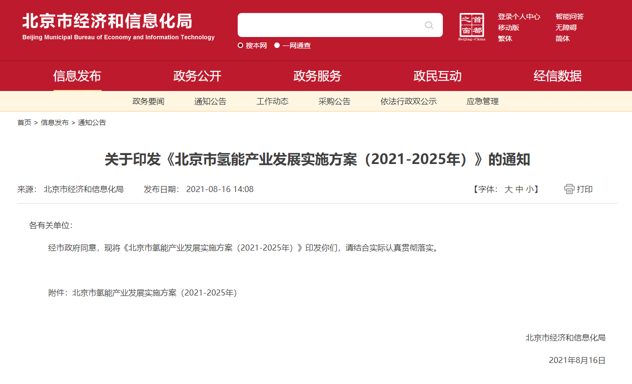央廣網(wǎng)北京8月17日消息(記者 萬玉航)記者從北京市經(jīng)濟和信息化局了解到,昨日,該局印發(fā)了《北京市氫能產(chǎn)業(yè)發(fā)展實施方案(2021-2025年)》的通知。