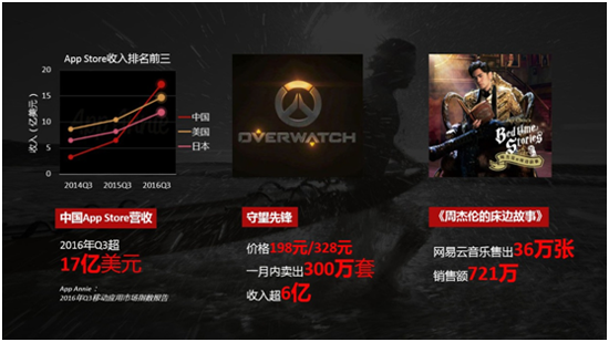 消費(fèi)升級(jí)的到來(lái)和中產(chǎn)階級(jí)的壯大,讓人們的消費(fèi)結(jié)構(gòu)發(fā)生了變化,虛擬商品越來(lái)越受歡迎。周楓引用了來(lái)自App Annie的數(shù)據(jù):2016 年第3季度中國(guó) iOS 商店收入超過(guò)17億美元,比美國(guó)市場(chǎng)高出了15%,成為全球iOS應(yīng)用商店收入最高的市場(chǎng)。