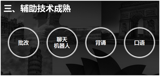 周楓提到,輔助技術(shù)(例如在課程中增加聊天機(jī)器人、批改系統(tǒng)、背誦監(jiān)測(cè)、口語(yǔ)練習(xí)等)的成熟,給在線課程提供了實(shí)實(shí)在在的幫助。盡管目前技術(shù)暫時(shí)還不能成為獨(dú)立的商業(yè)產(chǎn)品,但是可以有效地提升在線課程產(chǎn)品的品質(zhì)和用戶體驗(yàn)。