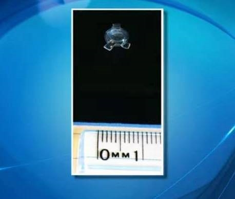 千萬不要以為這個又是一種新的隱形眼鏡,不是的。它由惰性親生物材料制成,不會遭到人體排斥,也不會變質(zhì)損耗,可終身矯正視力,只要把這個小片片放到你的眼睛里,再用生理鹽水沖洗,10秒后,這個仿生晶體就會擴(kuò)散到你的整個眼球。