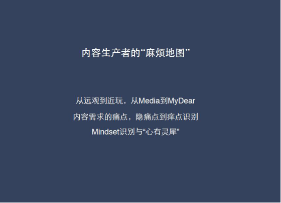 內(nèi)容生產(chǎn)者本身有很多的痛點。我們經(jīng)常說痛點:打個比方,在百度地圖上,北京只是一個點,但你把地圖放大的時候,會發(fā)現(xiàn)北京不是一個點,他有各式各樣小的更小的、更小的,也許是更重要的一些點,你逐漸放大的時候會發(fā)現(xiàn)這個城市各式各樣的信息。所以我們僅僅說痛點往往是一個很粗略的說法,我們要從一個痛點出發(fā),把地圖上的一個點變成一張詳實的地圖,這就是對需求的深度識別,我把它稱之為麻煩地圖。你要把每一個內(nèi)容生產(chǎn)者的麻煩詳細的地描繪出來。