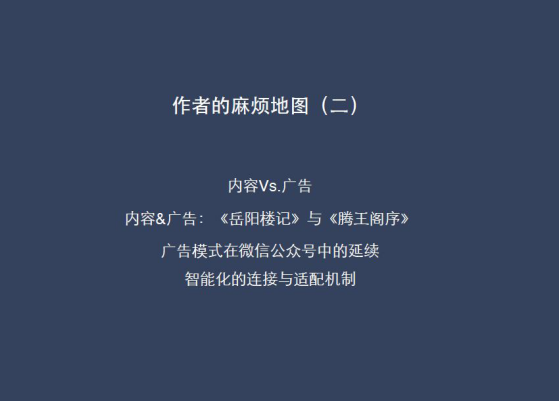 實際上在內(nèi)容生產(chǎn)的領(lǐng)域,我們是可以找到一個可以迎合二者鴻溝的方法,只不過這個方法過去我們一直找不到,但現(xiàn)在就可以找到。事實上在過去的很多內(nèi)容創(chuàng)作里,我們也能看到某些內(nèi)容本身就是廣告,廣告本身也是內(nèi)容,盡管創(chuàng)造內(nèi)容的時候,他并沒有想到去做一個廣告,但是達到的廣告效果往往比一個刻意制造的廣告的效果好幾百、幾萬倍。比方說,江蘇省旅游局沒有給過范仲淹稿費,但沒如果有這岳陽樓記,可能岳陽的地方旅游業(yè)根本就開展不起來。